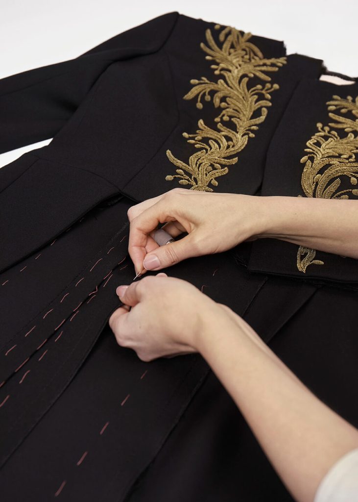 El bordado, realizado íntegramente a mano, es de un tono latón monocromático con forma de oliva. Las hojas y se extienden simétricamente sobre el cuello, la parte delantera de la chaqueta y las mangas.