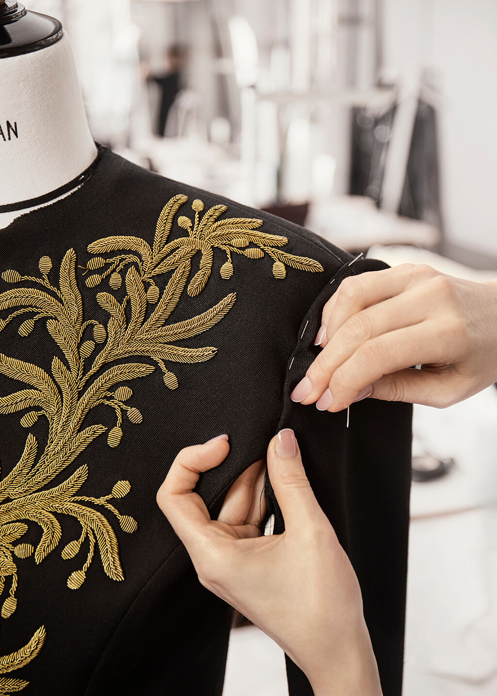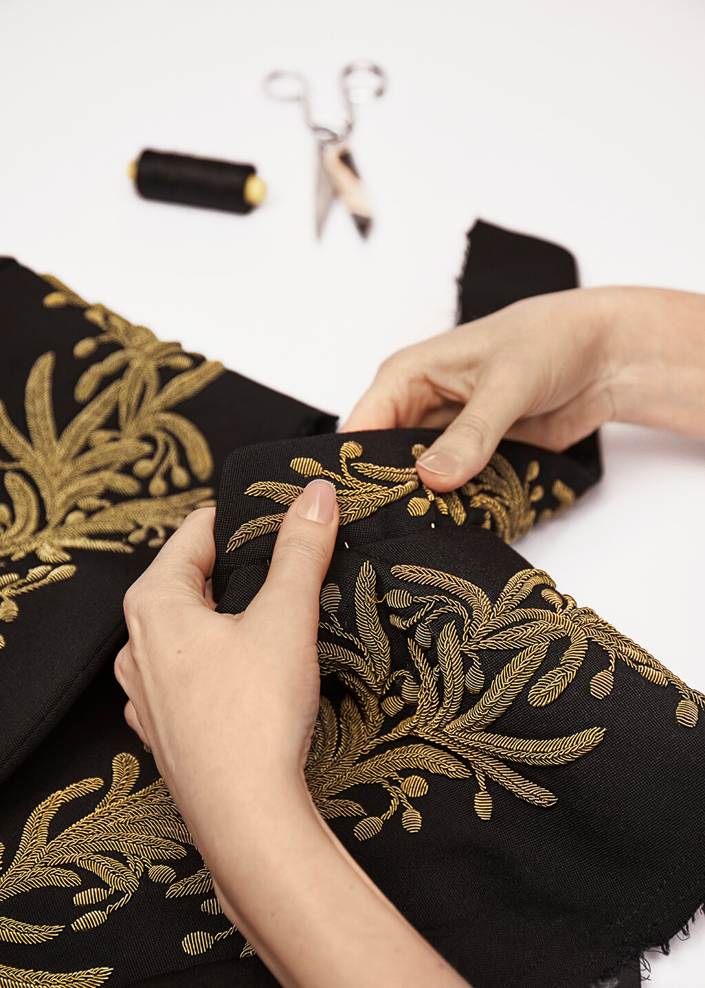 El bordado, realizado íntegramente a mano, es de un tono latón monocromático con forma de oliva. Las hojas y se extienden simétricamente sobre el cuello, la parte delantera de la chaqueta y las mangas.