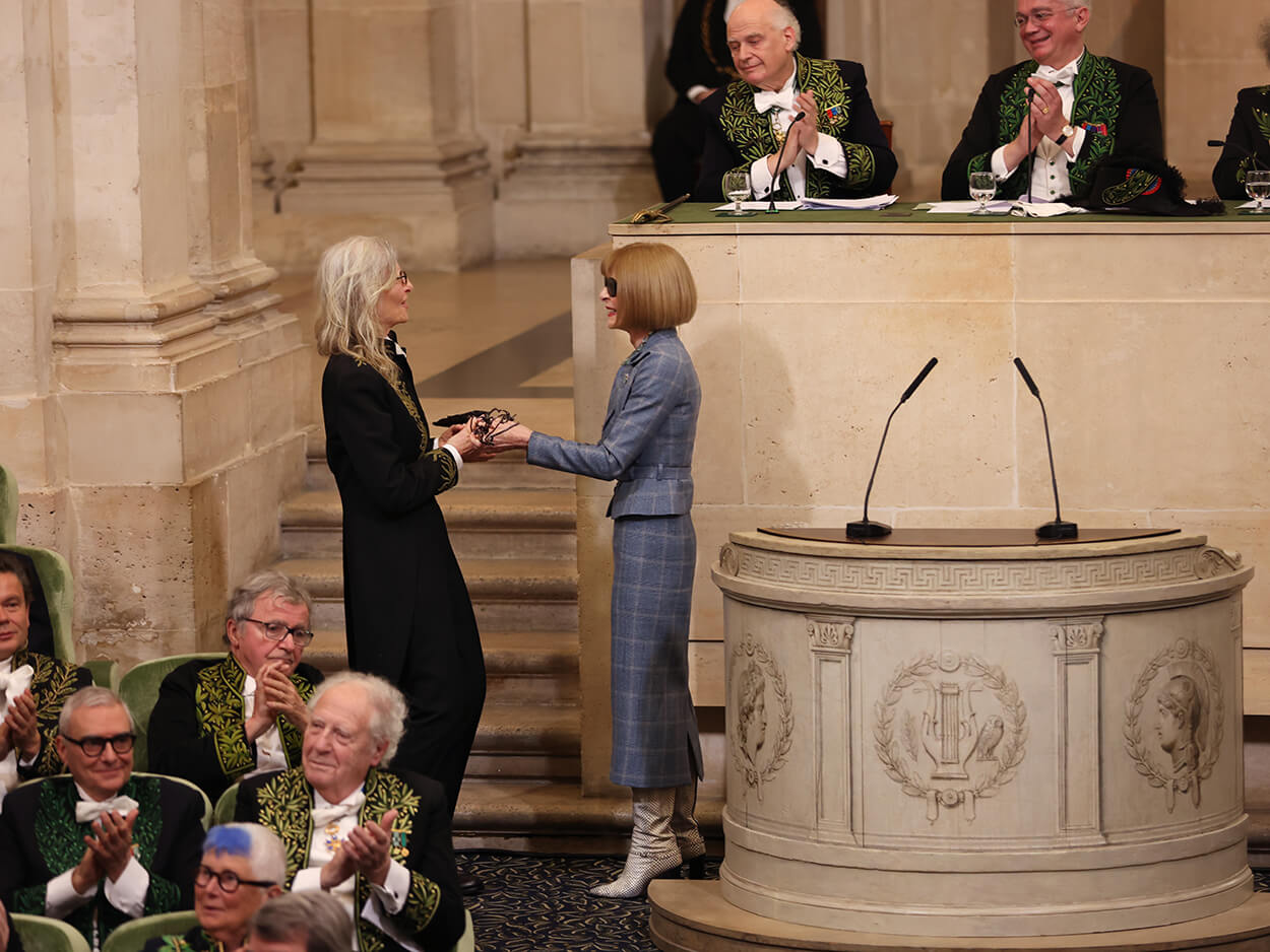 Al final de la sesión, Anna Wintour, directora de contenidos editoriales de Condé Nast y directora editorial global de Vogue, le entregó su título académico, la emplemática espada.