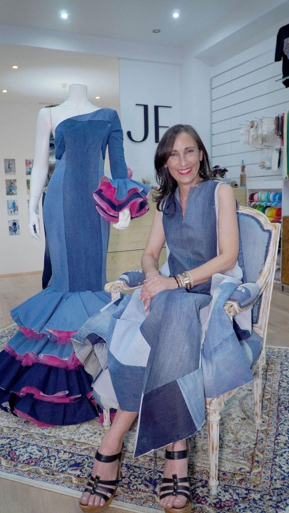 Josefa Fernández con su enfoque innovador del upcycling a medida se consagra como la reina del denim, utilizando tejidos de alta calidad denim como lienzos en blanco. La diseñadora hace uso de esta técnica que se basa en el reciclaje de forma creativa de los tejidos añadiendo una gran dosis de creatividad y elevando la pieza a algo único.