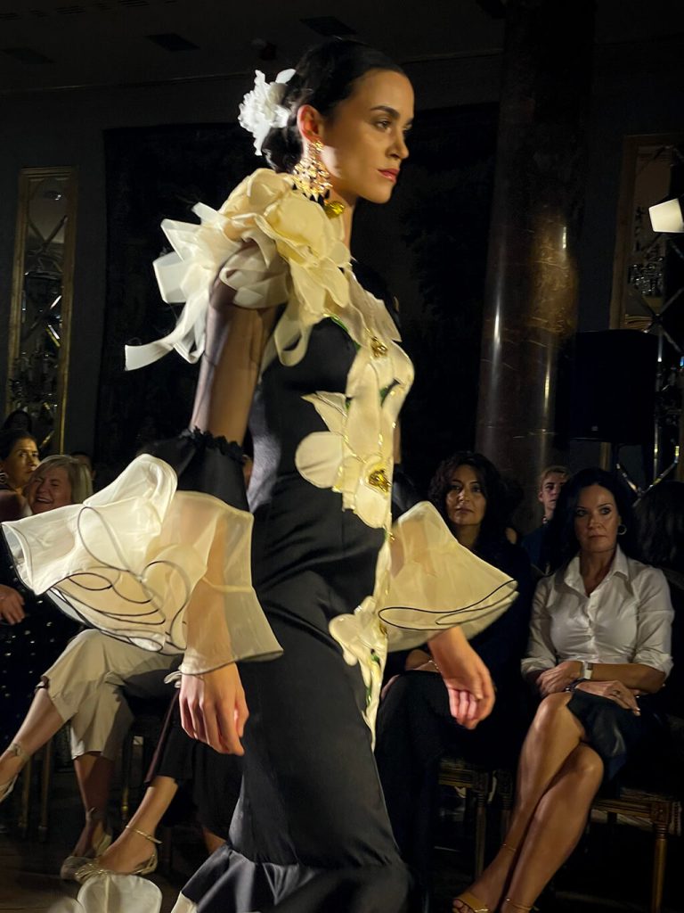 Las flores XL se convirtieron en protagonistas, añadiendo un toque de dramatismo y feminidad a los trajes. Estas aplicaciones florales de gran tamaño crearon una estampa impactante y llamativa, llevando la moda flamenca a la última tendencia de las grandes casas de moda. Además, las transparencias en gasas y encajes inundaron los vestidos, creando un juego sensual de ocultar y mostrar que capturó la imaginación de todos los presentes.