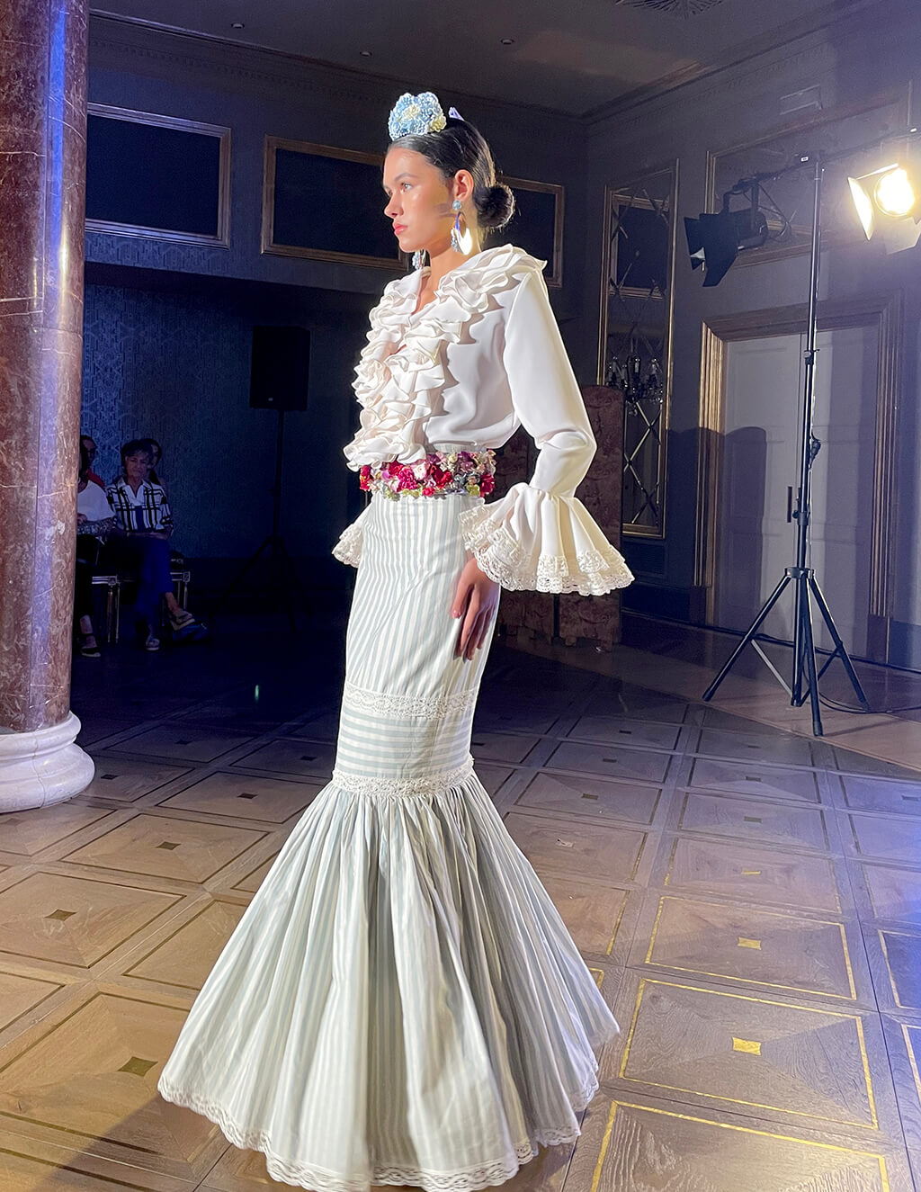 Uno de los cambios más notables fue el uso audaz del denim en los trajes de flamenca. Este material, que alguna vez fue considerado puramente casual, ha encontrado su camino en las pasarelas flamencas. Los diseñadores jugaron con las aberturas, creando elegantes detalles cut out que se mezclan perfectamente con los volantes tradicionales. Esta fusión de lo contemporáneo y lo clásico añadió una nueva dimensión a los trajes flamencos, demostrando que la moda puede ser atrevida sin perder su esencia.