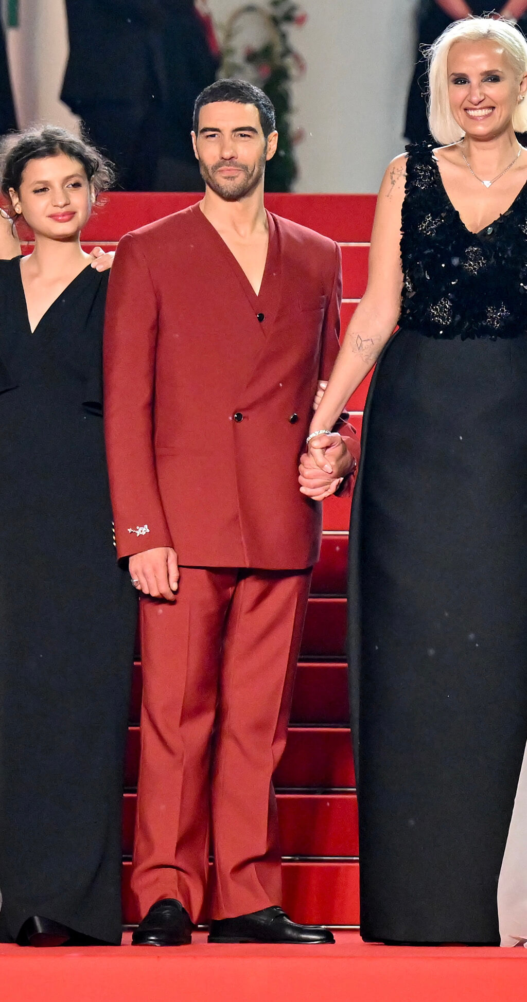 Tahar Rahim luce una chaqueta cruzada sin cuello, hecha a medida, en rojo intenso, con chaleco y pantalones a juego, y mocasines negros de piel suave. También lleva un reloj Tambour de acero inoxidable con esfera gris y un broche Elegance engastado con un diamante LV Monogram de talla estrella y diamantes de la colección Awakened Hands, Awakened Minds de Alta Joyería de Louis Vuitton. © Louis Vuitton – All rights reserved