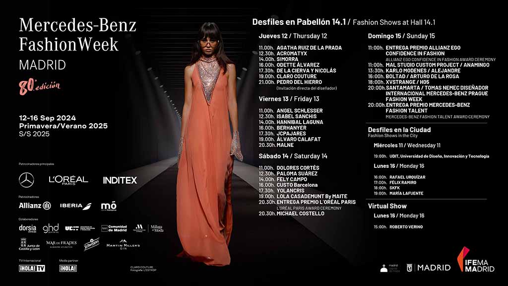 La gran pasarela de la moda MBFWMADRID alcanza su 80 edición con jornadas que se realizarán de 12 al 16 de septiembre dentro de un calendario pleno de nombres reconocidos de la moda española y nuevos talentos que aterrizará en el Pabellón 14.1 de IFEMA.