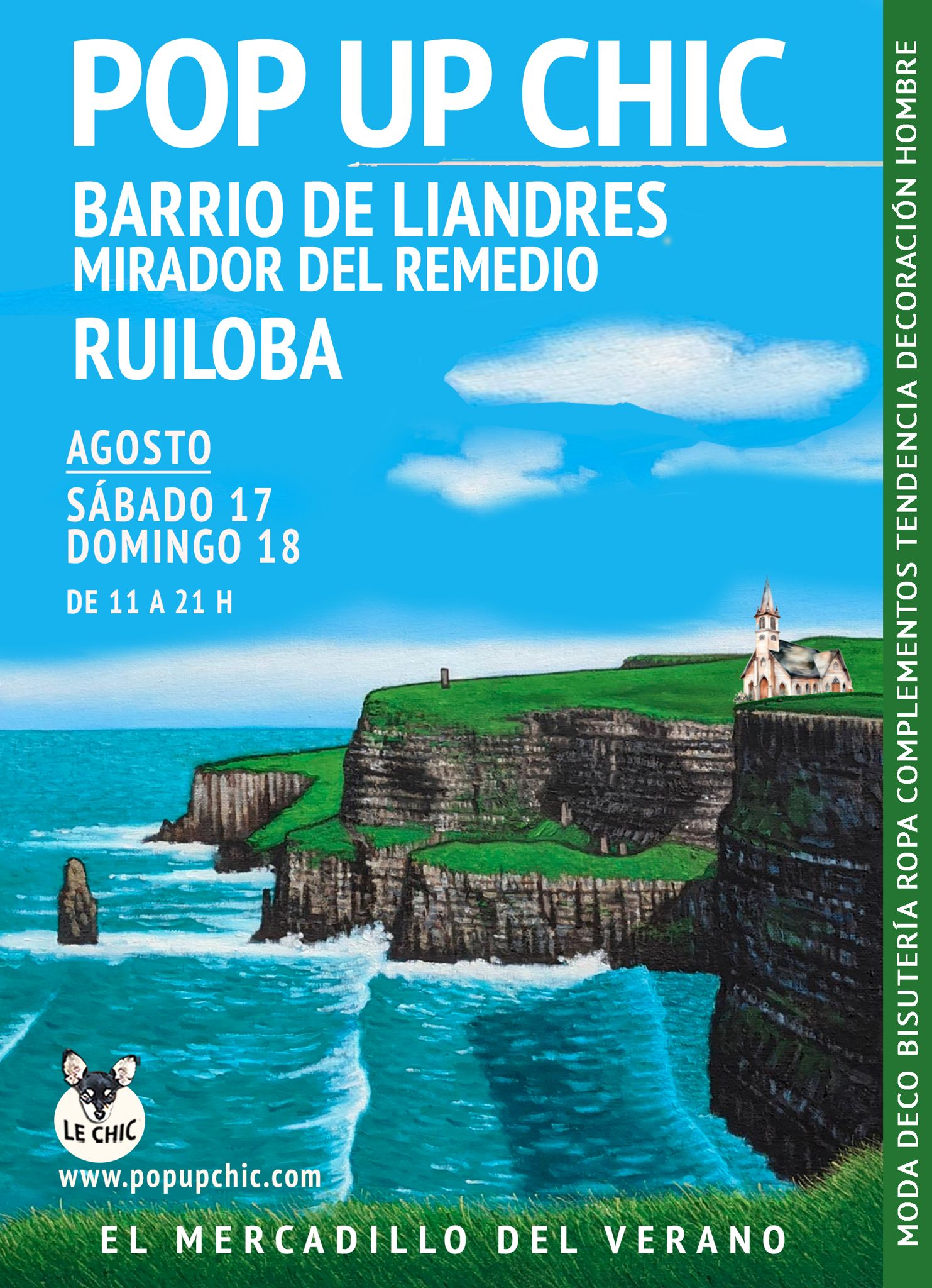RUILOBA: Este mercadillo Pop Up CHIC tendrá lugar Ruiloba, Cantabria el 17 y 18 de agosto de 11 a 21.00 horas y estará ubicado en el mirador del Remedio (Barrio de Liandres). Este plan estival está ideal para disfrutar de compras en familia. Este mercadillo cuenta con la presencia de más de 30 firmas, dedicadas a la moa con una zona chill out y oferta gastronómica en la que por las tardes actuarán grupos de la zona con música en vivo y en directo.
