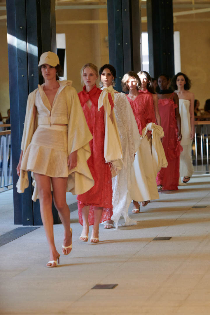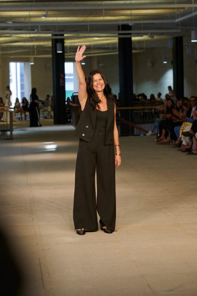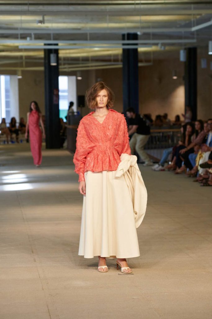 «El Viaje» de Pilar Dalbat destaca prendas pensadas para estas experiencias y se refleja en la elección de materiales naturales y técnicas artesanales. Hace uso del denim camel de 100% algodón orgánico, con un acabado desflecado a mano que aporta un toque prêt-à-couture. También incluye piezas de crêpe de china de seda natural pintadas a mano, en tonos tierra y verdes, combinadas con lino lurex en vestidos y túnicas. El jacquard se utiliza en abrigos ligeros y prendas de entretiempo, mientras que para la noche predominan tejidos texturizados como georgettes de seda, crepes satinados y rasos, creando una colección exótica y versátil.