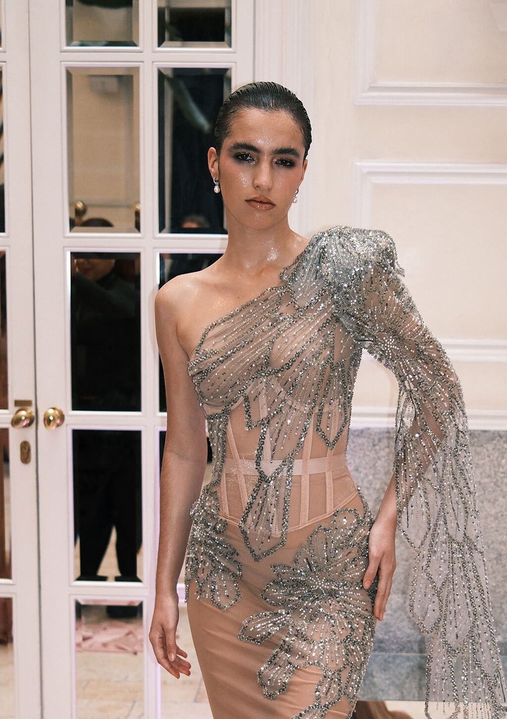 La colección nace de un proceso profundamente personal. Después de una propuesta anterior más intensa y oscura, Costello canaliza una transformación emocional y artística que se traduce en una búsqueda de claridad y optimismo. “Mi colección está pensada como sirenas recién salidas del mar”, explica el diseñador durante este encuentro. Describe la estética etérea en la que las modelos, con efecto wet y tejidos vaporosos, evocan una feminidad casi acuática.