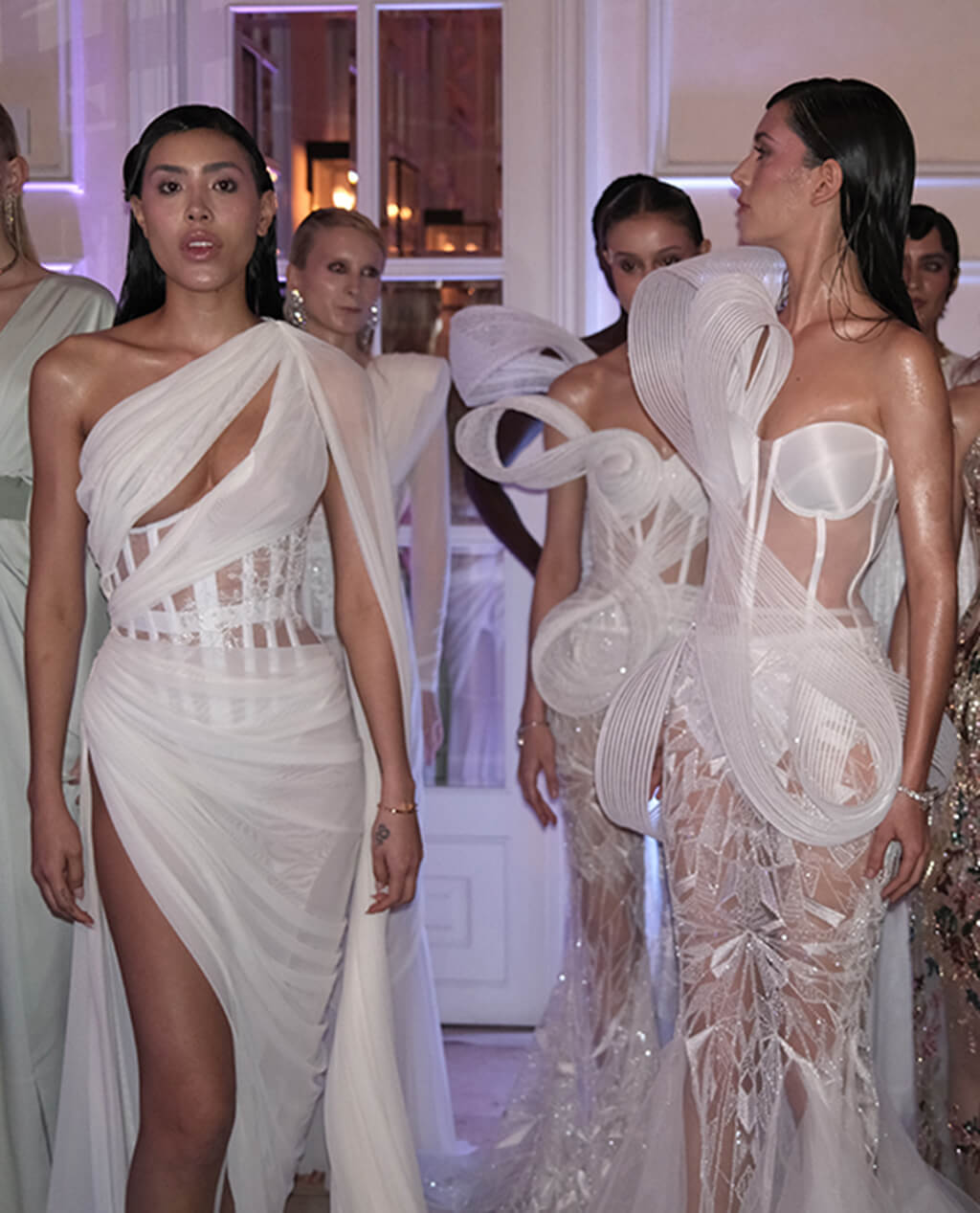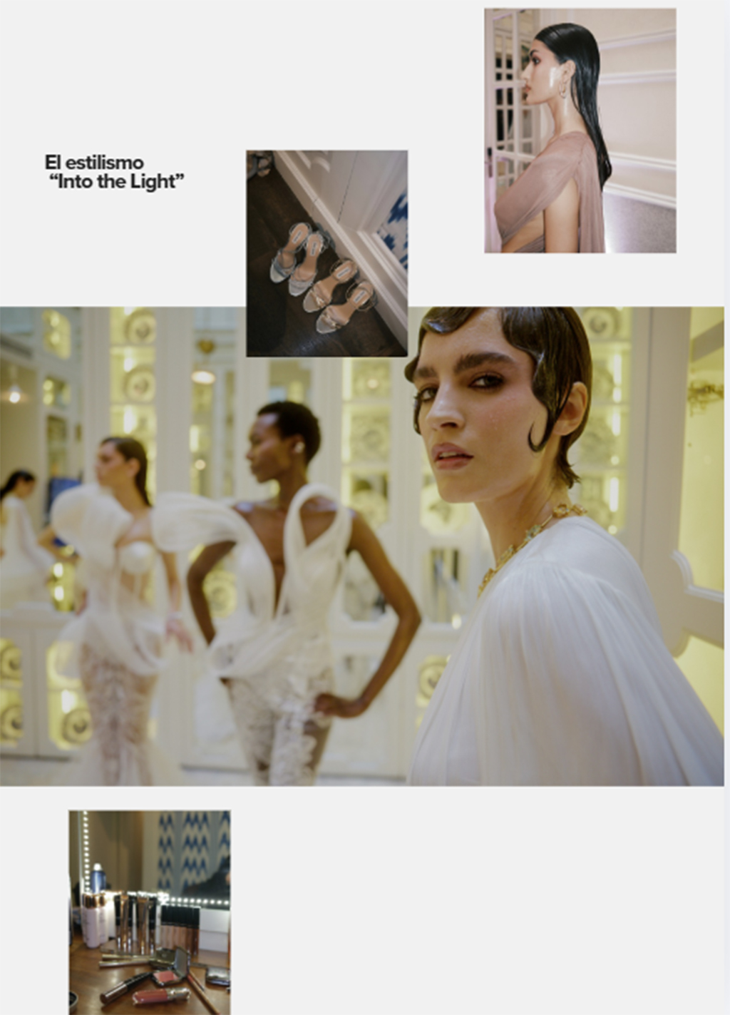 El resultado es una colección de fuerte carácter escultórico, donde el drapeado, con pliegues fluidos y caídas orgánicas, se combina con tejidos ligeros. Cada brillo en las piezas, potenciado por los destellos de Swarovski reforzaban la narrativa de renacimiento. La paleta cromática, dominada por blancos, marfiles y tonos perlados, recrea una sensación de calma, pureza y esperanza.