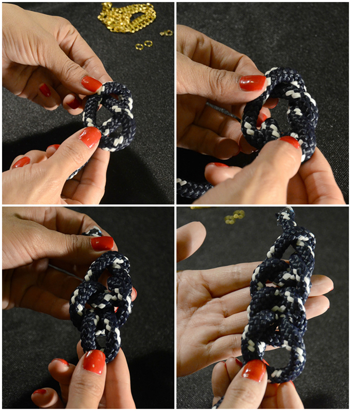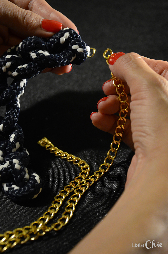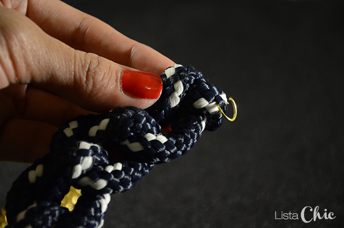 Colocamos las anillas o argollas y unimos con la cadena y el cierre.
