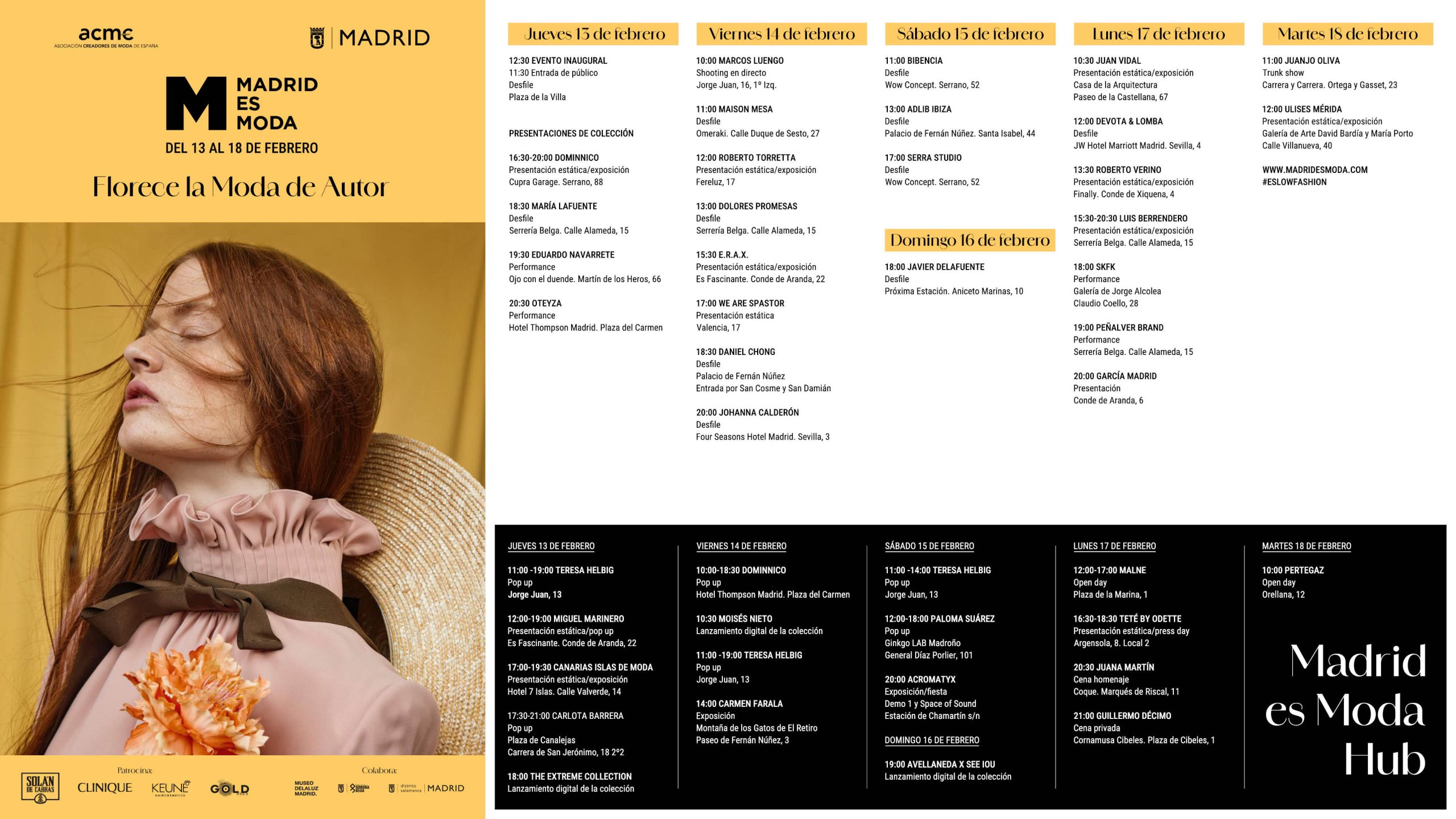 En total son 40 diseñadores y firmas que dentro de Madrid es Moda exhibirán sus colecciones en galerías de arte, atelieres, tiendas, restaurantes, hoteles y otros lugares representativos de Madrid. Este febrero se incorpora, además, Madrid es Moda HUB, un programa paralelo de actividades, como pop ups, open days, lanzamientos digitales y charlas.